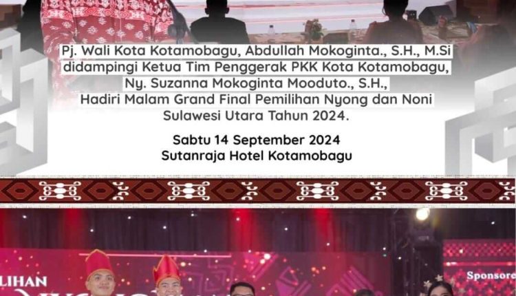 KOTAMOBAGU –Penjabat WaliKota Kotamobagu, Abdullah Mokoginta., S.H., M.Si didampingi Ketua Tim Penggerak PKK Kota Kotamobagu, Ny. Suzanna Mokoginta Mooduto., S.H., Hadiri Malam Grand Final Pemilihan Nyong dan Noni Sulawesi Utara Tahun 2024, bertempat di Sutanraja Hotel, Kotamobagu, Sabtu (14/9/2024) kemarin.