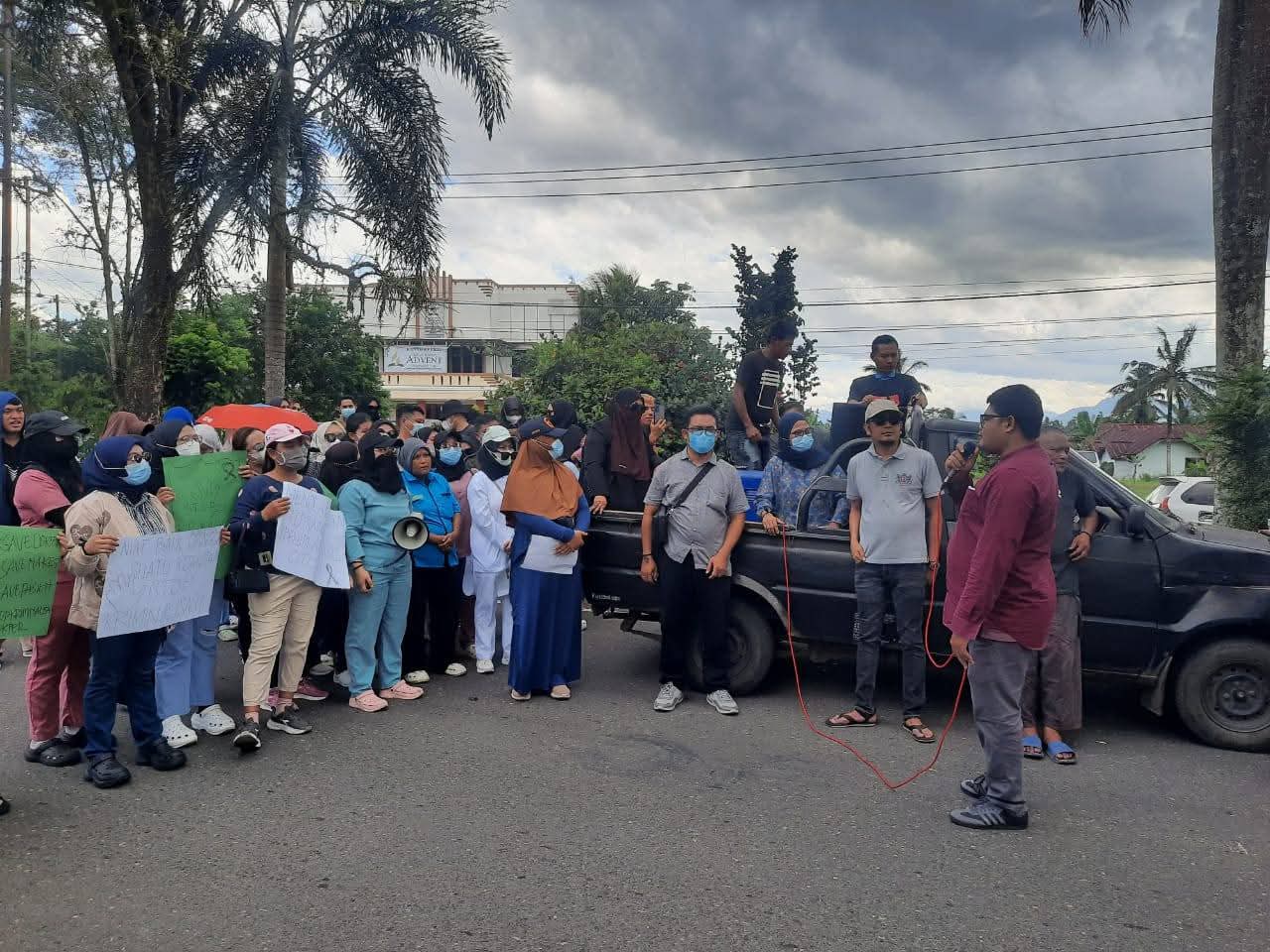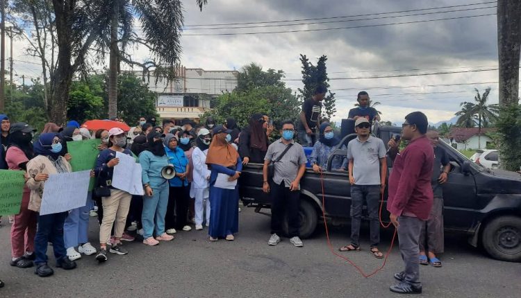 KOTAMOBAGU – Puluhan massa aksi yang terdiri dari tenaga kesehatan dan karyawan RSIA Kasih Fatimah Kotamobagu menggelar demonstrasi di depan Kantor DPRD Kotamobagu