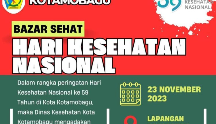 TOPIKBMR.NEWS, KOTAMOBAGU – Dinas Kesehatan (Dinkes) Kota Kotamobagu bersiap untuk menggelar Bazar Sehat sebagai bagian dari peringatan Hari Kesehatan Nasional (HKN) yang ke-59. Acara ini akan menyajikan berbagai pelayanan kesehatan gratis bagi masyarakat. Kegiatan ini dijadwalkan akan berlangsung di Lapangan Bonobokon, Kelurahan Molinow, Kecamatan Kotamobagu Barat pada hari Kamis, 23 November 2023, dimulai pukul 05.30.