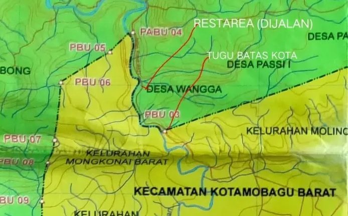 “Kalau kita melihat lampiran peta, titik lokasi dimana Tugu Selamat Datang dibangun adalah Pilar Batas Utama atau PBU 03, yang masuk wilayah Kotamobagu. Setelah area Tugu yaitu arah ke Desa Lobong, batas wilayahnya dipisahkan melalui Sungai Katulidan, sebelah kiri sungai adalah wilayah Kotamobagu hingga ke Pilar Acuan Batas Utama (PABU) 04 di pertigaan jalan ke arah Desa Wangga, Kecamatan Passi Barat,” ucap Ivone.