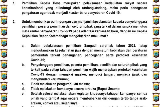 Guna tercapai Pilsang yang aman, kondusif dan tak menjadi klaster baru penyebaran Covid-19, Kapolres Kotamobagu AKBP Irham Halid, SIK mengeluarkan maklumat yang isinya sebagai berikut :