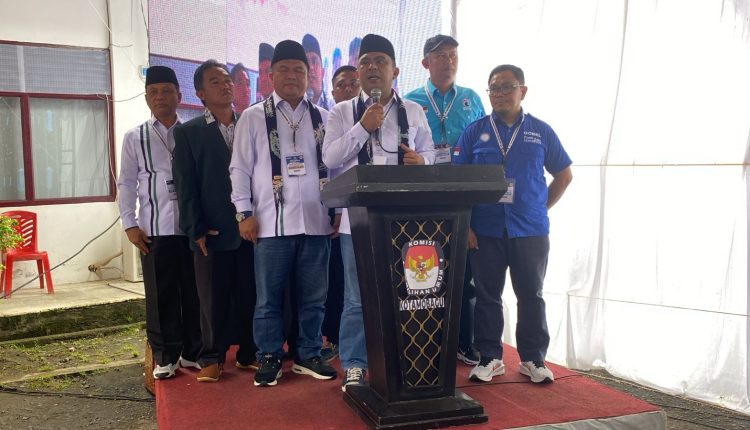 Dalam konferensi pers yang berlangsung penuh semangat di halaman Sekretariat KPU Kotamobagu, Meiddy dan Syarifuddin berdiri tegak, menatap massa yang hadir dengan penuh keyakinan.
