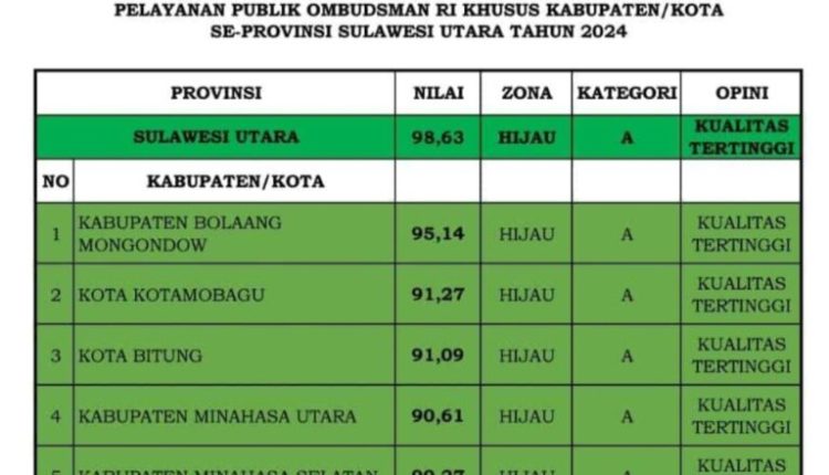 KOTAMOBAGU – Pemerintah Kota Kotamobagu mencetak prestasi membanggakan dengan meraih nilai 91,27 kategori A dalam penilaian kepatuhan penyelenggaraan pelayanan publik tahun 2024. Hasil ini menempatkan Kotamobagu dalam zona hijau, dengan opini kualitas tertinggi. Penilaian ini tertuang dalam Surat Keputusan Ketua Ombudsman Republik Indonesia Nomor 252 Tahun 2024 tentang hasil kepatuhan penyelenggaraan pelayanan publik.