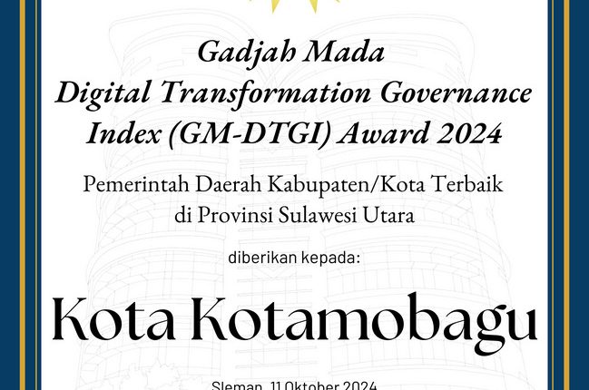 Penghargaan bergengsi ini diberikan oleh Pusat Kajian Sistem Informasi (PKSI) FEB Universitas Gadjah Mada Yogyakarta, sebagai pengakuan atas upaya digitalisasi yang telah dijalankan Pemkot Kotamobagu.