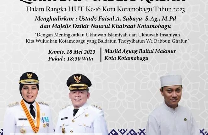 Hal ini sebagaimana dikatakan ketua Panitia HUT Kotamobagu, Sugiarto Yunus, zikir dan tablig akbar ini menghadirkan Ustadz Faisal A. Sabaya, S.Ag, M.Pd.