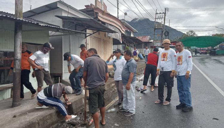 Bersama masyarakat, Sangadi terpilih ini bergotong royong melakukan pembersihan saluran drainase yang menjadi penyebab banyaknya sampah berhamburan di jalan ketika hujan deras.