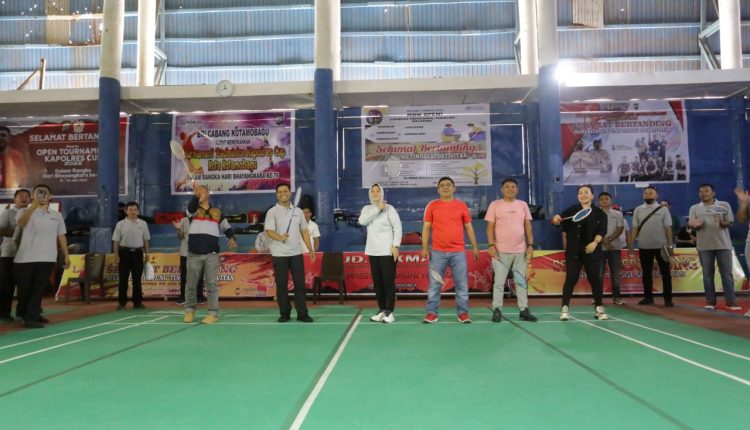 TOPIKBMR.NEWS,KOTAMOBAGU — Wali Kota Kotamobagu Tatong Bara, setelah melepas kegiatan Fun Bike juga membuka kegiatan Open Tournament Badminton Kapolres Cup Tahun 2022, Minggu (19/6/2022) di gedung Korpri Kotamobagu.