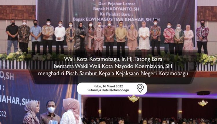 TOPIKBMR.NEWS,KOTAMOBAGU – Wali Kota Kotamobagu, Ir. Hj. Tatong Bara menghadiri Pisah Sambut Kajari Kotamobagu dari pejabat lama, Hadiyanto, SH kepada pejabat baru Elwin Agustian Khahar, SH, MH.