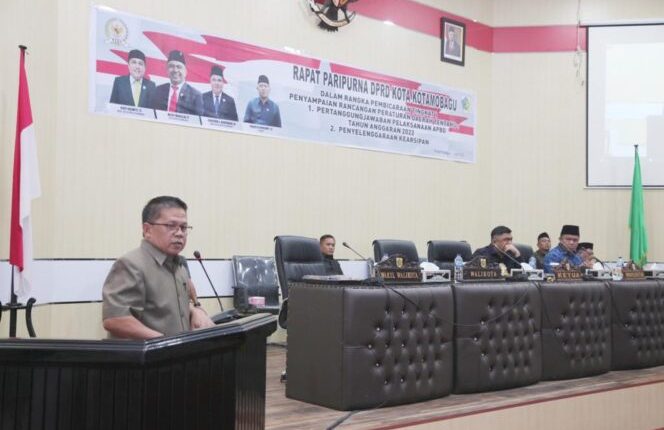 TOPIKBMR.NEWS, KOTAMOBAGU — Wakil Wali Kota Kotamobagu, Nayodo Koerniawan, menyampaikan Rancangan Peraturan Daerah (Ranperda) tentang Pertanggungjawaban pelaksanaan APBD Kota Kotamobagu Tahun Anggaran 2022, pada pelaksanaan Rapat Paripurna DPRD Kota Kotamobagu, Senin, 10 Juli 2023.